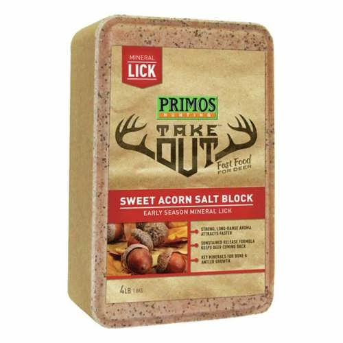 The Take Out Sweet Acorn Salt Block makes it easy for hunters to get a jump on the season with a proven, durable, and convenient mineral attractant. Set it down in early season and its strong, long-range sweet corn aroma goes to work instantly to attract deer to your spot. Made with premium ingredients all deer crave and a sustained release formula, Sweet Acorn Salt Blocks pull them in and keeps them coming back. As they feed, key minerals boost bone and antler growth to improve the quality of your herd. Use the Sweet Acorn Salt Blocks as part of your Take Out Seed & Feed System to implement a simple, proven, and effective plan in your area.
