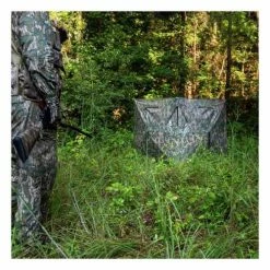 Thousands of very small holes dot the fabric. On the outside, the camo print and natural light force human and animal eyes to focus on the camo, making the holes “invisible.” On the inside the black print and darkened interior allow your eyes to focus through the holes for a clear view of the outside