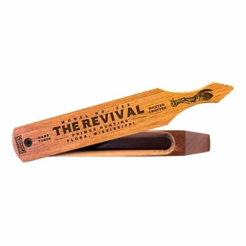 The Primos Revivalβ’ is a long box that can be run loud or soft for prospecting or finishing a bird that last little bit. Loud high pitch long yelps and cuts for prospecting and locating birds is easy with the long paddle and trough. Also, use to finish off a bird with soft yelps or purrs.